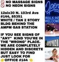 Behind AmPm 1**2**6**3**0 (N) 103rd Ave Office #144, 85351, White 2 story #144 BehindΒ Arco AmPm Gas station Open Daily 9am-10pm.Β Multicultural Staff $60 / FullBody Massage Add'll Treatments = Add'l Fees Packages 200-300-400