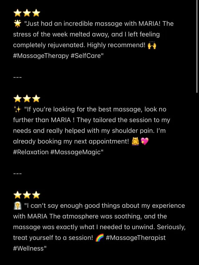 Iโm warm, friendly, and outgoing, with a passion for creating a positive and relaxing experience. Your comfort and satisfaction are always my top priority. ๐ธโจ Enjoy a calming, unforgettable session with me ๐ฅฐ๐who truly cares about helping you unwind. I take pride in offering a professional, personalized experience that youโll remember for all the right reasons. ๐ The experience is